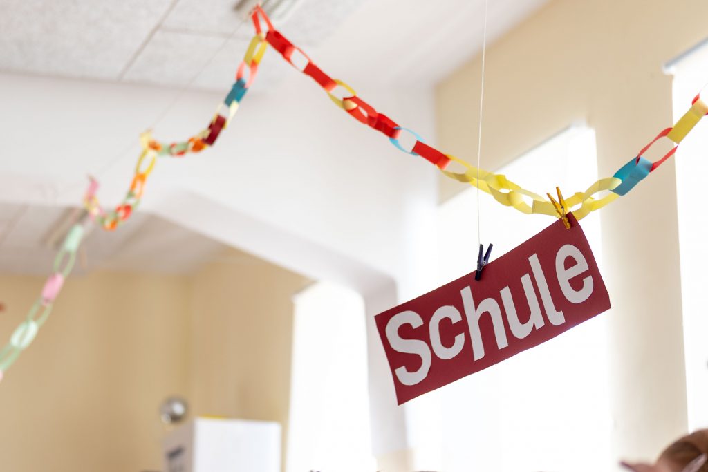 Durch ein Spalier aus älteren Schülerinnen und Schülern wurden die Schulneulinge zu ihrer ersten Unterrichtsstunde begleitet. Dort bemalten sie als erste kleine Aufgabe ihre eigenen Turnbeutel.