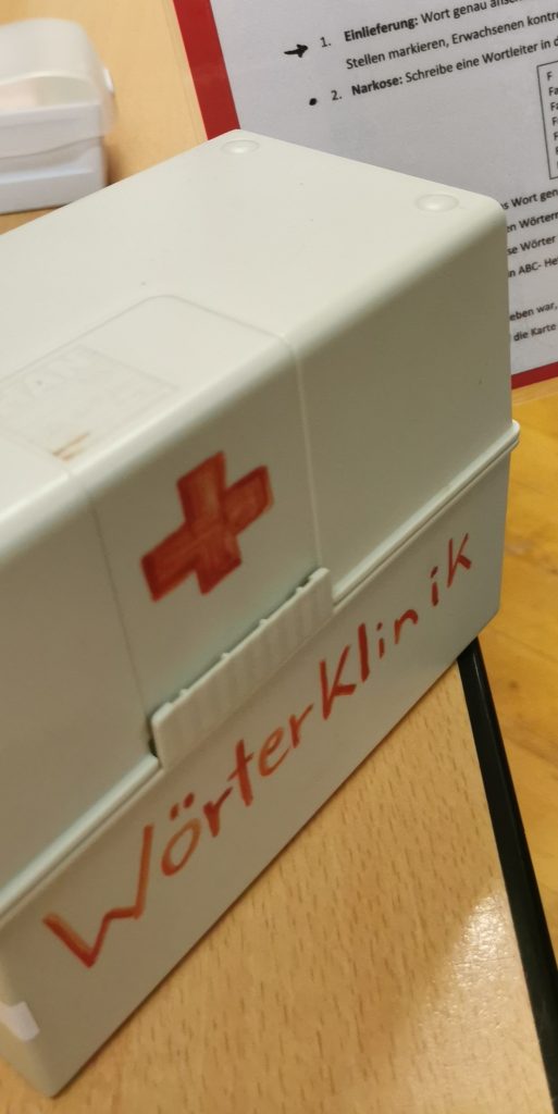 Zum Schluss wurde dann Barbie zur OP in die Wörterklinik eingeliefert. Die Klinik behandelt „schwierige“ Wörter und Kinder üben damit Rechtschreibung ohne Druck. Bei der Einlieferung wird ein Wort mit orthographischen Herausforderungen auf eine Karteikarte geschrieben und die schwierige Stelle markiert. Dann durchläuft es die Narkose, wo die Kinder es mehrfach abschreiben. Es folgen Operation und Pflege und das Wort darf entlassen werden, wenn es nach einem kleinen Diktat richtig geschrieben wurde.